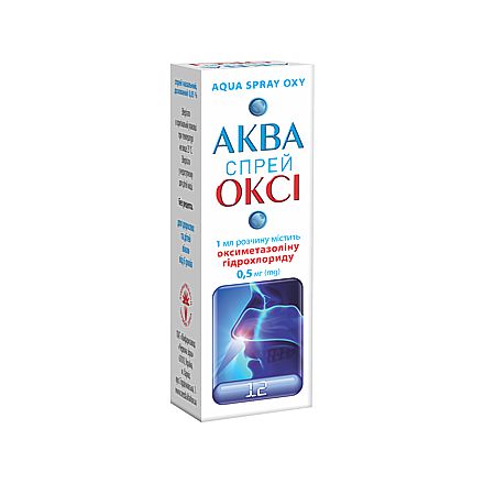 Фармакодинаміка. АКВА СПРЕЙ ОКСІ належить до групи місцевих судинозвужувальних засобів. Оксиметазолін чинить симпатоміметичну та судинозвужувальну дію, усуваючи набряк слизової оболонки носа. Звужує судини у місці нанесення, зменшує набряк слизової оболонки носа та верхніх дихальних шляхів, зменшує виділення з носа. Відновлює носове дихання. Усунення набряку слизової оболонки носа сприяє відновленню аерації придаткових пазух, порожнини середнього вуха, що запобігає розвитку бактеріальних ускладнень.