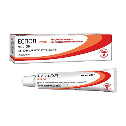 Фармакотерапевтична група. Засоби, які застосовують місцево при суглобовому і м’язовому болю. Препарати стручкового перцю і подібні засоби. Код АТС М02А В. Еспол чинить аналгезивну, відволікаючу, зігріваючу, розсмоктувальну, протизапальну та місцевоподразнювальну дію. Лікувальний ефект зумовлений комплексною дією компонентів, що входять до складу препарату. Капсаіцини екстракту перцю стручкового чинять сильну місцевоподразнювальну дію на чутливі рецептори шкіри; диметилсульфоксид чинить аналгезуючу та протизапальну дію, проявляє помірну фібринолітичну активність, препарат підсилює проникнення крізь непошкоджену шкіру і слизові оболонки лікарських засобів, сприяє глибшому проникненню лікарської речовини, що застосовується разом із ним; олія коріандрова чинить загальнозміцнювальну і тонізуючу дію; олія лавандова проявляє слабкозаспокійливі і спазмолітичні властивості. Компоненти мазі спричиняють рефлекторне розширення дрібних судин і покращують кровопостачання у вогнищі болю, у результаті чого посилюється дренаж цієї ділянки і відбувається видалення продуктів запалення. Ефект спостерігається через 10 – 15 хвилин після застосування препарату і досягає максимуму через 30 хвилин. Тривалість знеболення від 30 хвилин до 2 годин.
