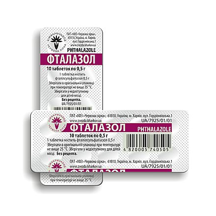 Фармакодинаміка Фталазол є сульфаніламідним препаратом широкого спектру дії, активний відносно грампозитивних та грамнегативних мікроорганізмів – збудників кишкових інфекцій. Чинить бактеріостатичну дію. Основний механізм дії обумовлений порушенням синтезу в мікроорганізмах їх ростових факторів – фолієвої і дигідрофолієвої кислот, необхідних для синтезу пуринів та піримідинів.