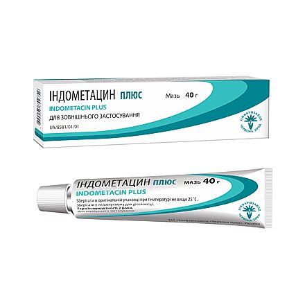 Склад: діючі речовини: індометацин, диметилсульфоксид; 1 г мазі містить індометацин 50 мг, диметилсульфоксид 50 мг; допоміжні речовини: олія м’яти перцевої, пропіленгліколь, поліетиленгліколь 400, поліетиленгліколь 1500.