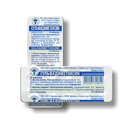 Особливості застосування. При лікуванні препаратом необхідно проводити систематичний контроль функції нирок і показників периферичної крові, рівня глюкози у крові. Сульфаніламіди, включаючи сульфадиметоксин, не застосовувати для лікування інфекцій, спричинених бета-гемолітичним стрептококом групи А, оскільки вони не спричиняють його ерадикацію і, отже, не можуть запобігти таким ускладненням як ревматизм та гломерулонефрит. Препарат необхідно з обережністю призначати хворим з хронічною серцевою недостатністю, захворюваннями печінки та при порушенні функції нирок. Сульфадиметоксин слід призначати з обережністю пацієнтам з тяжкою формою алергічних захворювань або бронхіальною астмою. З обережністю слід застосовувати сульфаніламіди, у тому числі сульфадиметоксин, пацієнтам, хворим на цукровий діабет, оскільки сульфаніламіди можуть вплинути на рівень цукру в крові. При лікуванні препаратом необхідно проводити систематичний контроль рівня глюкози в крові. Оскільки сульфаніламіди є бактеріостатичними, а не бактерицидними препаратами, необхідний повноцінний курс терапії для запобігання рецидиву інфекцій і розвитку стійких форм мікроорганізмів. Пацієнтам необхідно споживати достатньо рідини для запобігання кристалурії і розвитку уролітіазу. Слід уникати призначення препарату пацієнтам старше 65 років у зв’язку з підвищеним ризиком розвитку тяжких побічних реакцій. Рекомендується уникати впливу прямих сонячних променів і штучного ультрафіолетового опромінення з огляду на можливість розвитку фотосенсибілізації при застосуванні сульфаніламідів. Під час лікування препаратом необхідно дотримуватися режиму дозування, застосовувати рекомендовану дозу з інтервалом в 24 години, не пропускати прийому. У випадку пропуску дози не подвоювати наступну дозу.